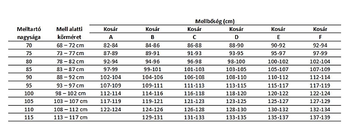 - 1. Mell alatti körméret: A bőséget ténylegesen közvetlenül a mell alatt mérjük. A mérőszalag feszes legyen, de nem szabad szorítania.
