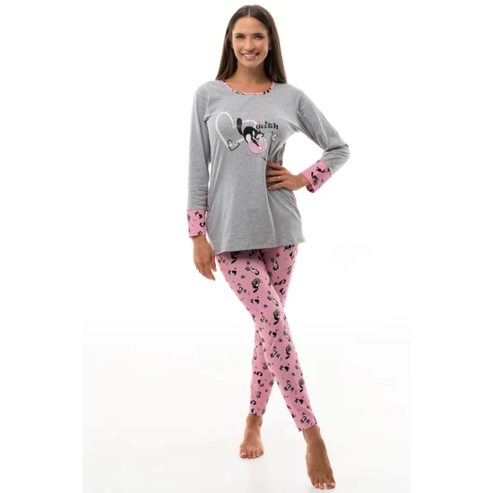 A POPPY AMINA hosszú ujjú pizsama tökéletes választás azoknak, akik a kényelem mellett a nőies megjelenésről sem szeretnének lemondani. A zsebes felső könnyed, csajos szabásával és Caty cicájával az elején, egyszerre kedves és divatos. A hosszú szárú, mintás leggings rugalmas pamut anyagból készült, amely puhán követi a mozgást, és egész éjszaka maximális komfortot biztosít.