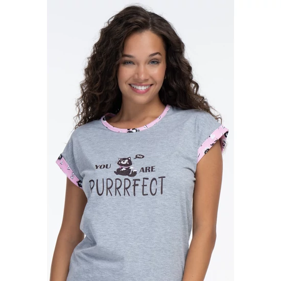 A szett tartalmaz egy extra kényelmes, karcsúsított felsőt valamint egy mintás rövidnadrágot. A felső kényelmes viseletet biztosít, miközben karcsúsított fazonja előnyösen követi testünk vonalait. A rövidnadrág saját tervezésű pamut anyagból készült, cicás mintával, mely vidámságot kölcsönöz viselőjének.